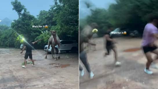 वीडियो में आप देख सकते हैं कि एक लड़कों का ग्रुप एक ऊंट के पास जाकर वीडियो बनाने लगता है. इस दौरान ऊंट चुपचाप पेड़ से पत्ते खा रहा होता है. तभी ग्रुप का एक लड़का पास आता है और पेड़ की टहनी तोड़कर ऊंट के मुंह के पास ले जाता है. उसे लगता है कि शायद ऊंट उसके दिए पत्ते खा लेगा. लेकिन, इसके बाद कुछ उल्टा ही हो जाता है. ऊंट भड़क जाता है और पलटकर लड़के पर हमला कर देता है. वो उसे काफी दूर तक खदेड़ना चालू कर देता है. इस दौरान वीडियो बना रहे बाकी लड़के भी भागना चालू कर देते हैं.