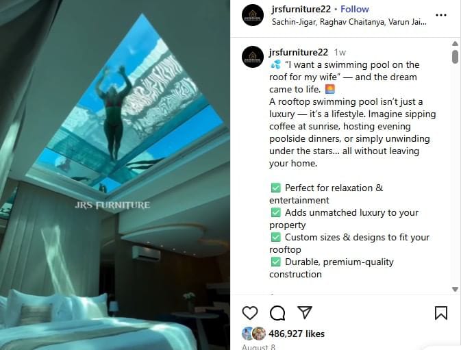सोशल मीडिया प्लेटफॉर्म इंस्टाग्राम पर एक वीडियो JRS Furniture के अकाउंट से शेयर किया गया है, जिसके कैप्शन में लिखा है, ‘क्लाइंट ने कहा, कि वह अपनी पत्नी के लिए बेडरूम की छत पर स्विमिंग पूल बनवाना चाहता है, क्या ये पॉसिबल है?’ जिसके बाद वीडियो में दिखाया जाता है कि कैसे बेडरूम की छत पर मजदूर स्विमिंग पूल बनाने में लग जाते हैं.
