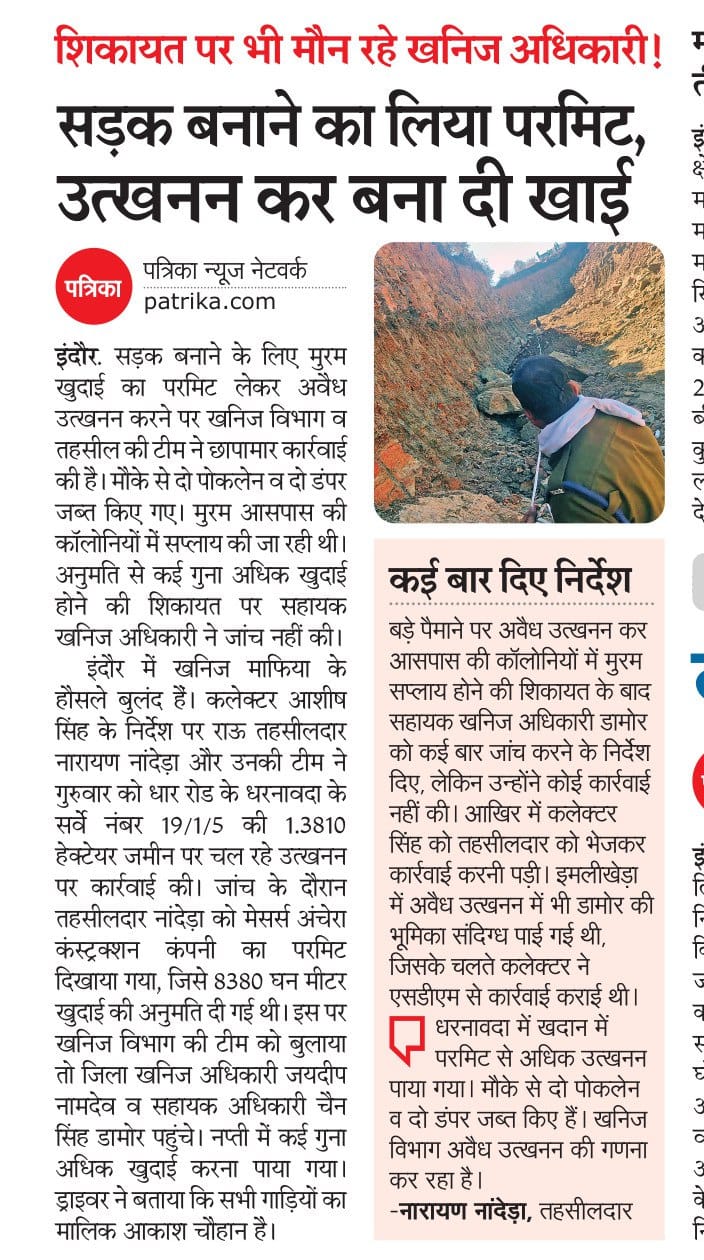 अपर कलेक्टर ज्योति शर्मा को कलेक्टर ने कार्रवाई के लिए कहा थे। इस मामले में कलेक्टर को शिकायत की गई थी कि धरनावद (राऊ) में मेसर्स अचेरा कंस्ट्रक्शन के नाम पर खोदाई की जा रही है।