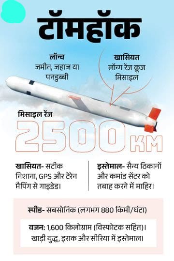 टॉमहॉक अमेरिका की खास क्रूज मिसाइल है। यह 1,000 मील (1609 किमी) तक उड़कर 1,000 पाउंड (453 किलो) विस्फोटक सटीक निशाने पर गिरा सकती है। इसके एडवांस वर्जन की रेंज 2500 किमी है।