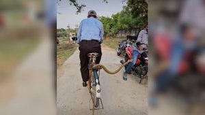 बता दें कि, जिस समय सांप चलती साइकिल के कैरियर में फंसा था, उस समय साइकिल चलाने वाले शख्स को जरा भी अंजादा नहीं था और वह अपनी मस्ती में पैडल मारते हुए साइकिल चला रहा था. यूजर्स ने कहा, अगर साइकिल चलाने वाले शख्स को पता होता, तो वह सबसे पहले उसे छोड़कर भाग जाता.