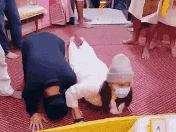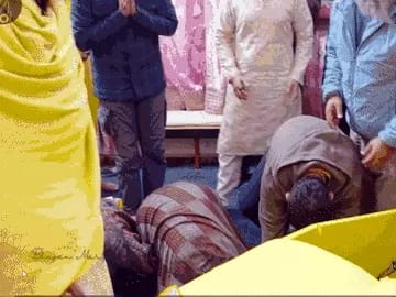 दोनों घुटनों के बल महाराज जी के सामने बैठे और सिर झुकाकर आशीर्वाद लिया। इस दौरान विराट-अनुष्का हाथ जोड़कर महाराज जी की बातें सुनते रहे। विराट सिर हिला-हिलाकर महाराज जी की बातें सुनते रहे, मुस्कुराते रहे।