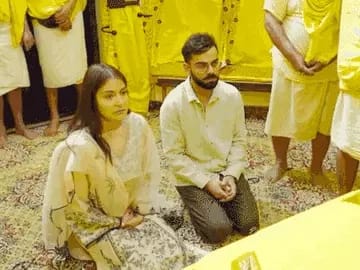 विराट कोहली, पत्नी अनुष्का शर्मा और दोनों बच्चों के साथ प्रेमानंद महाराज के आश्रम पहुंचे। अनुष्का ने प्रेमानंद महाराज से भक्ति के लिए आशीर्वाद मांगा।