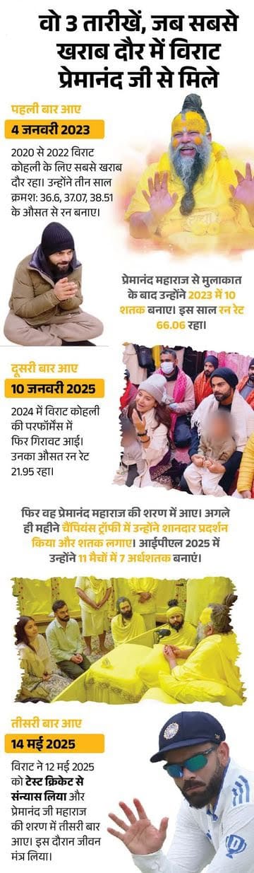 क्रिकेट से संन्यास लेने की घोषणा के बाद संत प्रेमानंद महाराज से मिले थे विराट ने 7 महीने पहले टेस्ट क्रिकेट से संन्यास लेने की घोषणा की थी। घोषणा करने के अगले दिन अनुष्का के साथ प्रेमानंद महाराज के आश्रम पहुंचे थे। विराट और अनुष्का ने वृंदावन के केली कुंज आश्रम में 15 मिनट तक प्रेमानंद महाराज से बात की थी। आश्रम में करीब ढाई घंटे रहे थे।