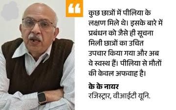 प्रबंधन बोला- 3 छात्रों की मौत की खबर बेबुनियाद इस पूरे घटनाक्रम पर वीआईटी प्रबंधन ने अपनी प्रतिक्रिया दी है। रजिस्ट्रार के.के. नायर ने दैनिक भास्कर को बताया कि कुछ समाचार माध्यमों में पीलिया से 3 छात्रों की मृत्यु की खबरें पूरी तरह बेबुनियाद हैं। इस पूरे घटनाक्रम से संस्थान की छवि को धक्का जरूर लगा है।