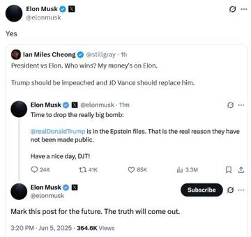 मस्क ने X पर लिखा- अब बड़ा खुलासा करने का टाइम है। डोनाल्ड ट्रम्प का नाम एपस्टीन फाइलों में हैं। यही वजह है कि इन्हें सार्वजनिक नहीं किया गया। डोनाल्ड ट्रम्प, आपका दिन शुभ हो।