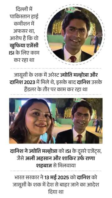 भारत सरकार ने 13 मई, 2025 को दानिश को 24 घंटे में देश छोड़ने का आदेश दे दिया। इससे पहले ही पाकिस्तान के लिए जासूसी करने वालों की धरपकड़ शुरू हो चुकी थी। शुरुआत हुई गजाला से। अब तक 11 लोग पकड़े जा चुके हैं। ये सभी पंजाब, हरियाणा और यूपी से हैं। बदले में इन्हें लड़कियों से दोस्ती, पैसे, घूमने का लालच दिया गया था।