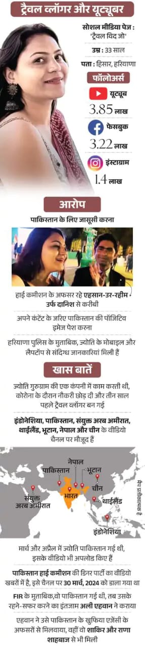 जासूसी के शक में पकड़े गए लोगों में सबसे चर्चित नाम यूट्यूबर ज्योति मल्होत्रा का है। पंजाब-हरियाणा पुलिस ने ज्योति को 16 मई को अरेस्ट किया था। ISI के हैंडलर दानिश से उसके करीबी रिश्ते थे। पाकिस्तान में वो ISI के एजेंट्स से मिलती थी।